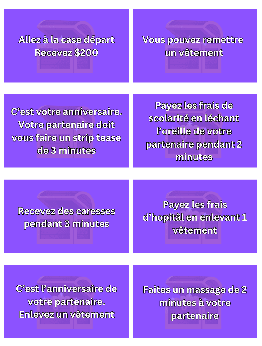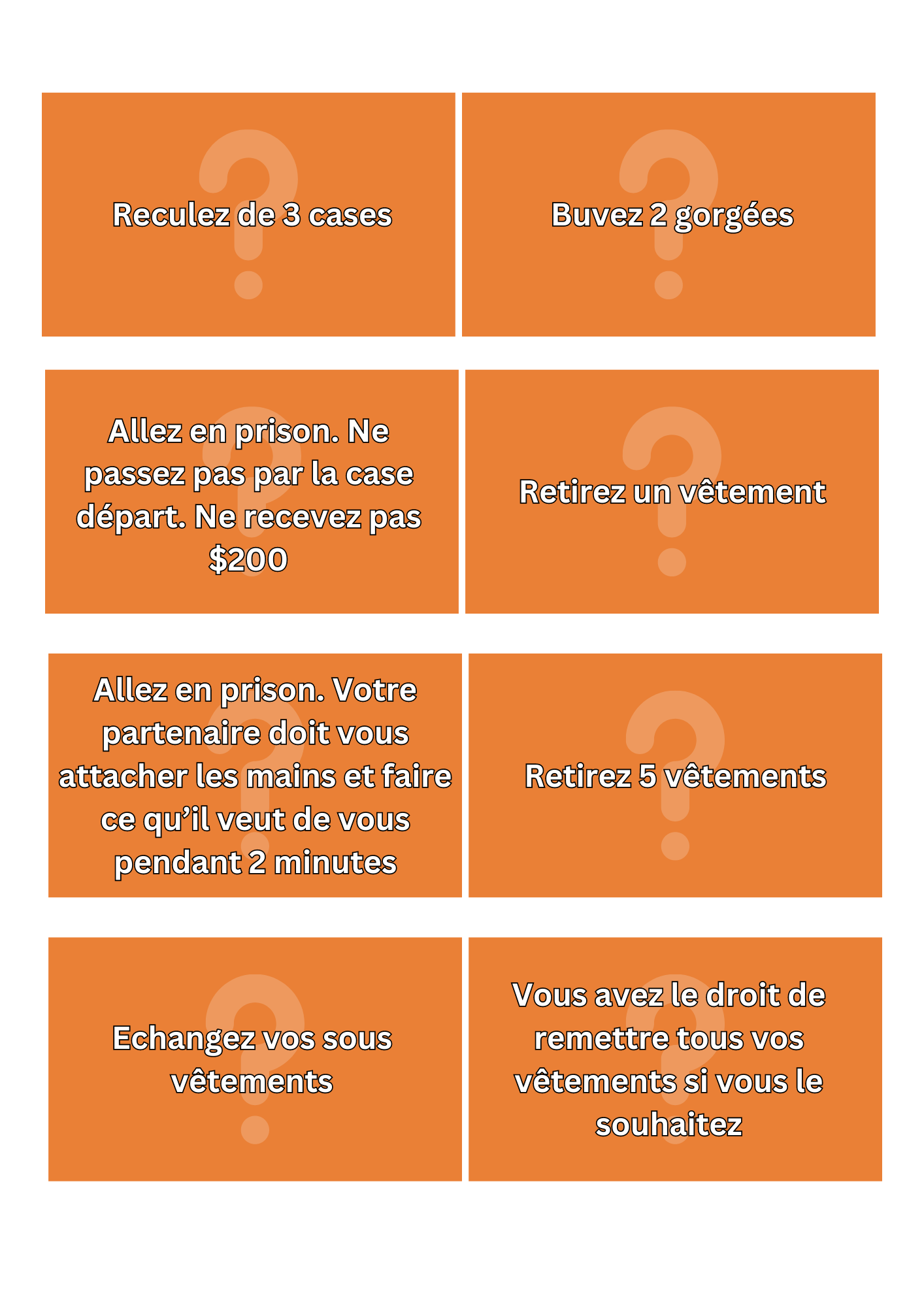 Chaque case et chaque carte comporte un défi auquel vous ou votre/vos partenaires devront se soumettre afin d'avancer dans la partie. Comme par exemple : " Attacher les mains de votre partenaire et faîtes ce que vous voulez de lui pendant 3 minutes"