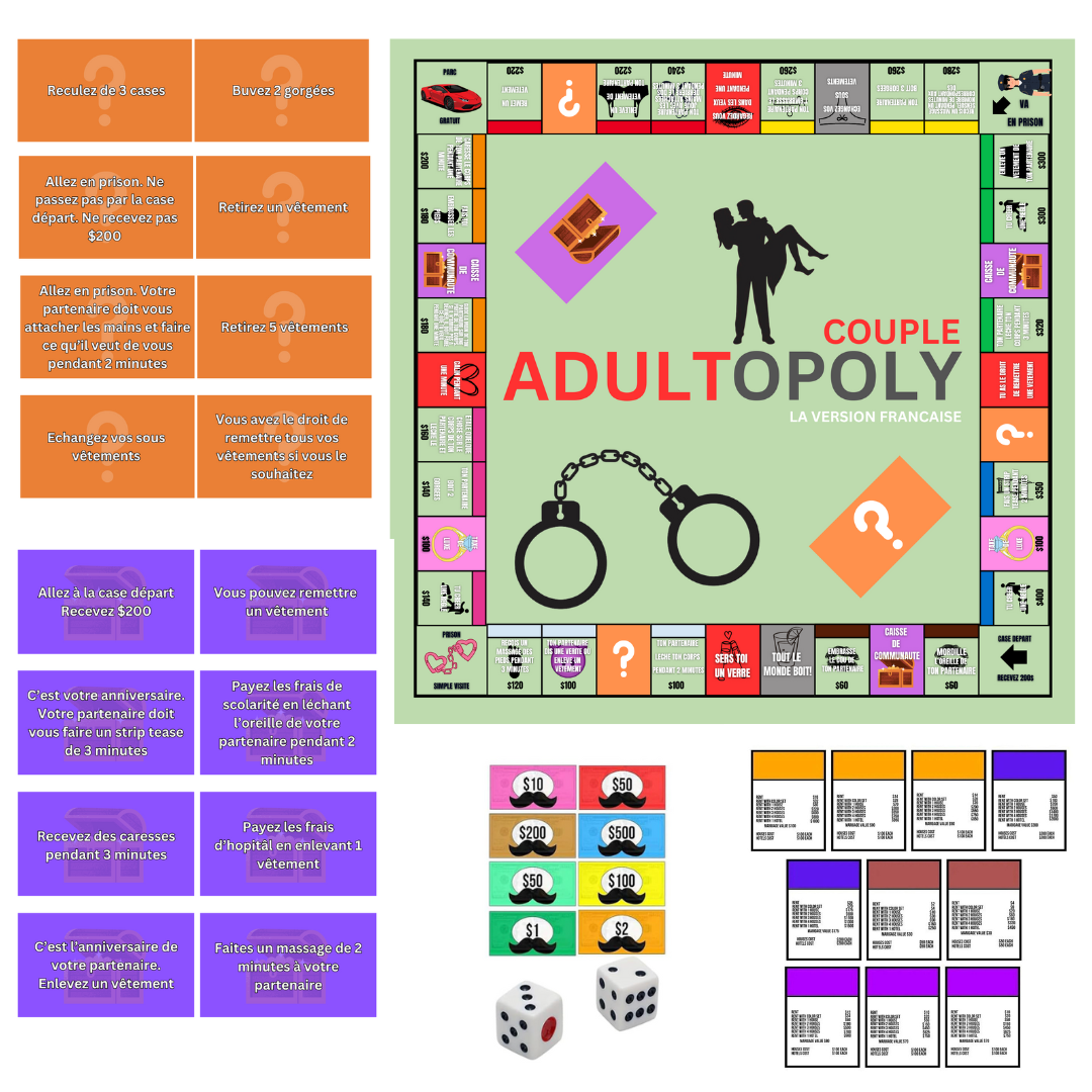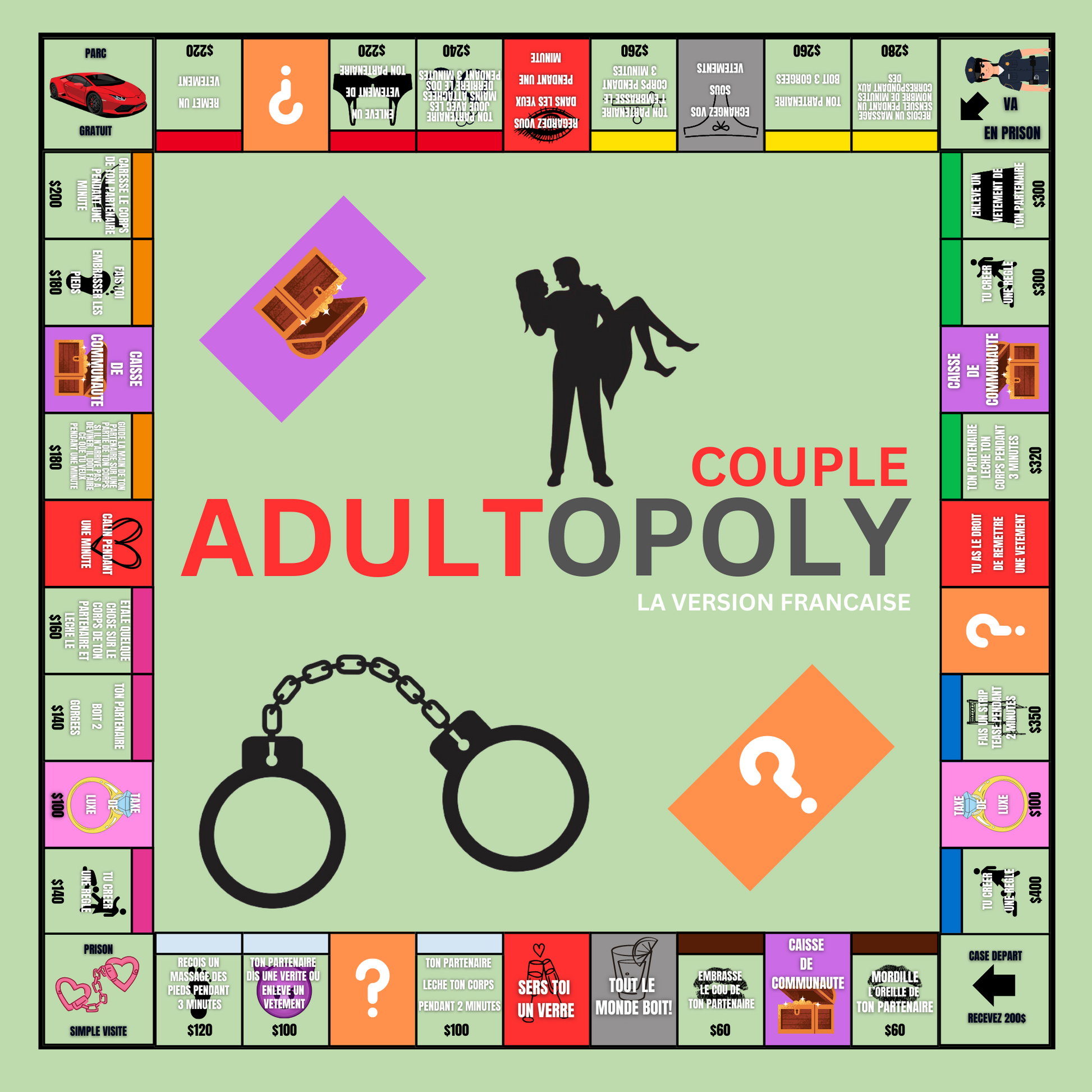 Entrez dans l’univers d’Adultopoly, où chaque décision peut vous faire vibrer. Ce jeu est conçu pour pimenter vos soirées avec votre partenaire ou à plusieurs avec des défis audacieux et des situations délicieusement imprévisibles. Préparez-vous à rire, à jouer et à... prendre du plaisir!